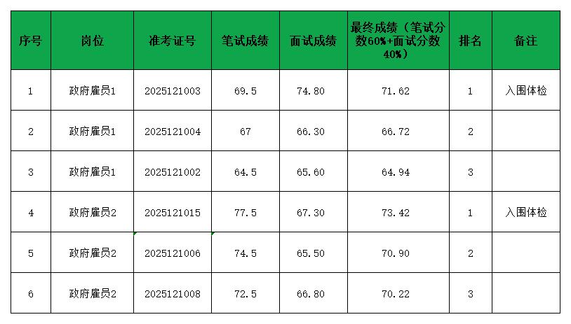 根据《中共揭阳市揭东区委宣传部、揭阳市揭东区妇女联合会2025年公开招聘政府雇员公告》,经发布公告、组织报名、资格审查、组织笔试和面试,现将考试成绩和入围名单公示如下:
